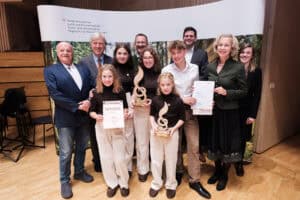 (c) BMLUK: Foto von links nach rechts: Herbert Kefeder (DCC Konzept GmbH), Georg Adam Starhemberg (Fürst Starhemberg’sche Familienstiftung), Georg Rappold (BMLUK), Florian Kinz (WIEHAG), Sektionschefin Elfriede Moser (BMLUK), Valerie Minihold (BMLUK) Im Vordergrund das Siegerensemble (1. Platz und Publikumspreis) Wood-Brass-Power (Kärnten)
